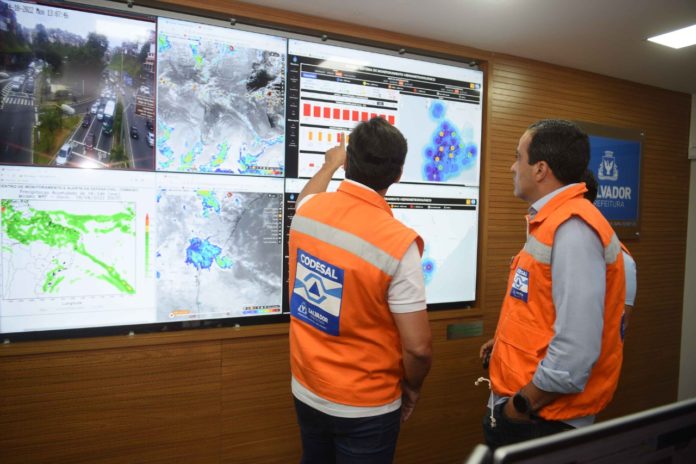 O prefeito Bruno Reis, ao lado do diretor geral da Defesa Civil de Salvador (Codesal), Sosthenes Macêdo, esteve na manhã desta segunda-feira (18), no Centro de Monitoramento de Alerta e Alarme (Cemadec), na Avenida Bonocô, para acompanhar de perto a atual situação climatológica de Salvador e a previsão de chuva para os próximos dias. No início desta tarde, mais três sirenes do sistema de alerta e alarme da Defesa Civil de Salvador (Codesal) foram acionadas nas localidades de Bom Juá (Calabetão), Baixa do Cacau (São Caetano) e Mamede (Alto da Terezinha).
