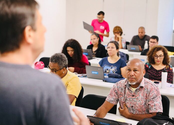 “Por ser uma plataforma de ciências da computação e entrarmos em uma rede de alunos e de professores que, na maioria, nunca tiveram acesso a esse conteúdo, entendemos que esse processo de formação precisa ser contínuo. Temos algumas frentes, a exemplo da formação inicial, das visitas às escolas e das pílulas formativas, que consistem na ampliação de temas e formação de horizontes. Essa formação que está ocorrendo aqui hoje é inicial, em que apresentamos a plataforma de uma forma lúdica para que os professores compreendam que é uma ferramenta intuitiva, fácil de manusear, e que o aluno consegue, de forma autônoma, realizar os exercícios”, explicou Ircione Braga, gerente operacional da Tech4Kids.